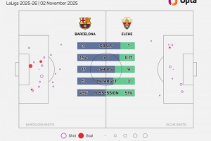 体育资讯11月3日讯 2025-26赛季西甲第11轮,埃尔切客场1-3不敌巴萨。本场比赛,埃尔切控球率达到了51%。