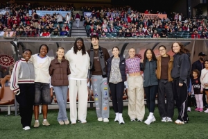 足篮联动!霍勒迪&阿夫迪亚造访女足波特兰荆棘队 阿福颠球秀球技