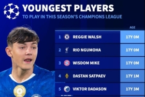 本赛季欧冠赛场最年轻球员排行:恩古莫哈、伦哈特-卡尔在列