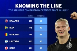 22-23赛季以来顶级前锋越位次数:哈兰德18次最少,C罗143次最多