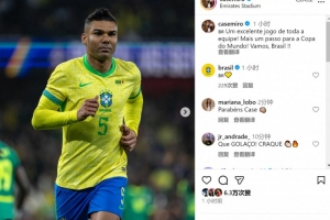 卡塞米罗社媒晒出比赛照片,写道:“全队都表现出色,距离世界杯又近了一步!加油巴西!”