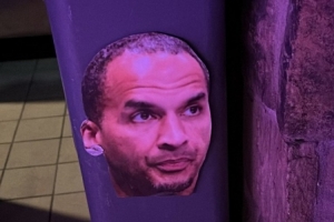 虾仁猪心!侠记晒照:达拉斯一酒吧外的垃圾桶上贴着哈里森头像
