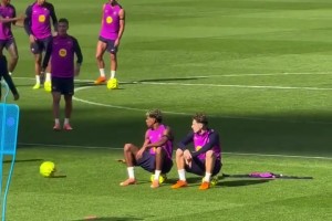 亚马尔和费尔明坐在球上探讨未来,一旁的巴尔德是真调皮~